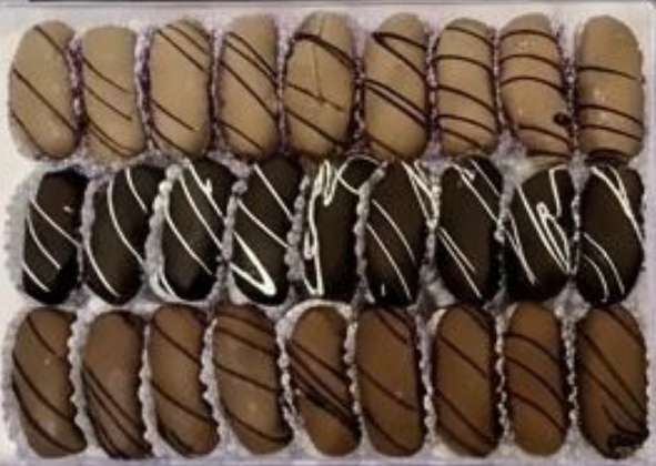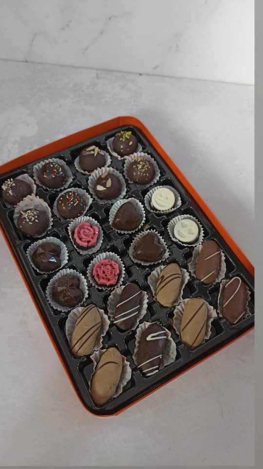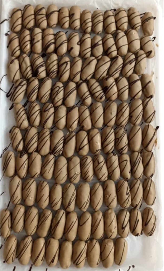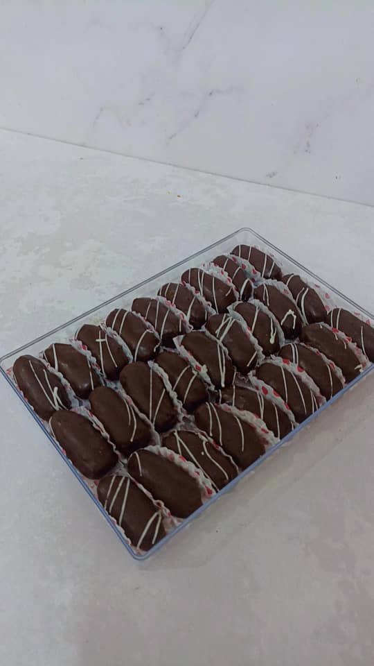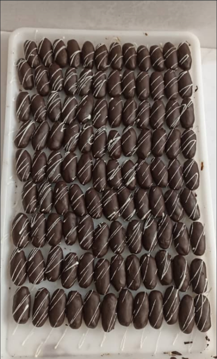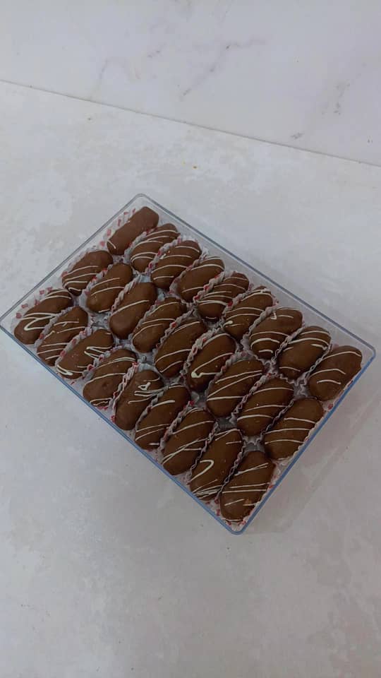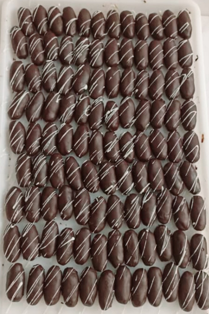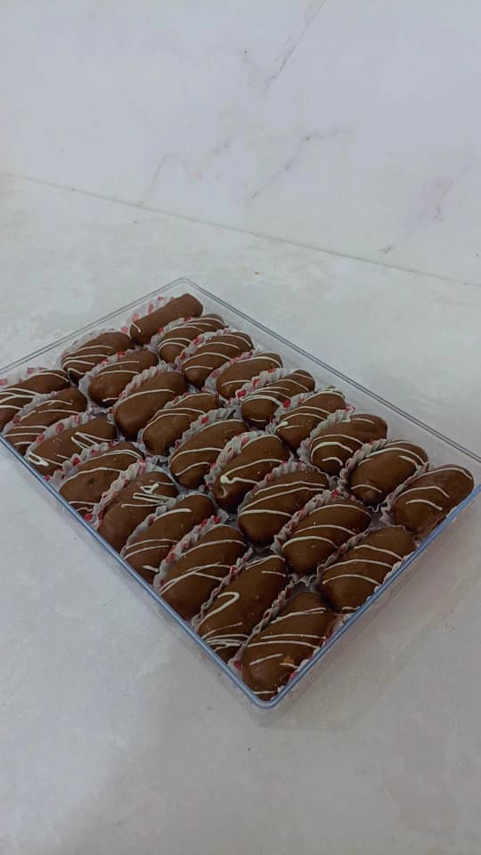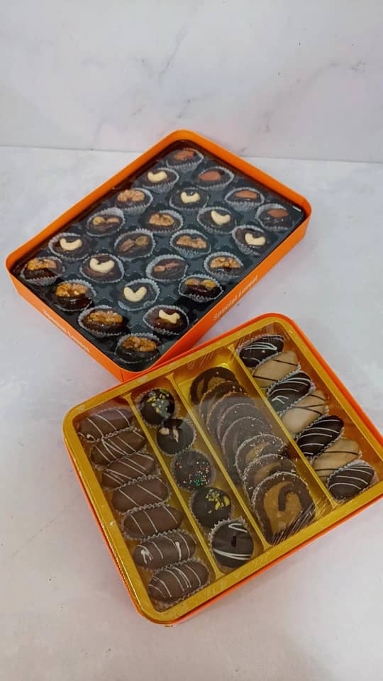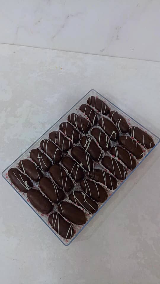 خرما شکلاتی با مغز بادام ایرانی و مغز گردو می باشد با روکش شکلات تلخ و شکلات قهوه همچنین شکلات کاکائویی تهیه گردید 🌴 برای سفارش شما می توانیدباتوجه به ذائقه شرکت کنندگان مجلس به صورت هرکدام تک محصولی بفرض فقط روکش شکلات تلخ🍫🍫 سفارش بدهید 🌴